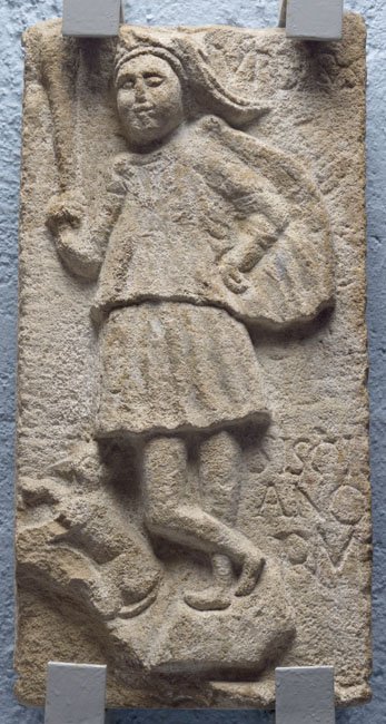 - Mythische Figur : ungerahmtes Rechteckfeld. Auf niedrigem Postament mit gekreuzten Füßen stehender Cautes in kurzem gegürteten Gewand, Mantel und phrygischer Mütze, in der Rechten Fackel. Unten nach rechts springender Hund.