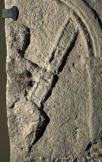 - Mythos (?) : oben unverzierte breite Randleiste, rechts glatter Pilaster. Links anschließend Pfeiler, der profilierten Rundbogen trägt. Im Bogenfeld menschliche Figur in Schrittstellung (?), die in den vorgestreckten Händen ein leiter-förmiges Objekt hält.