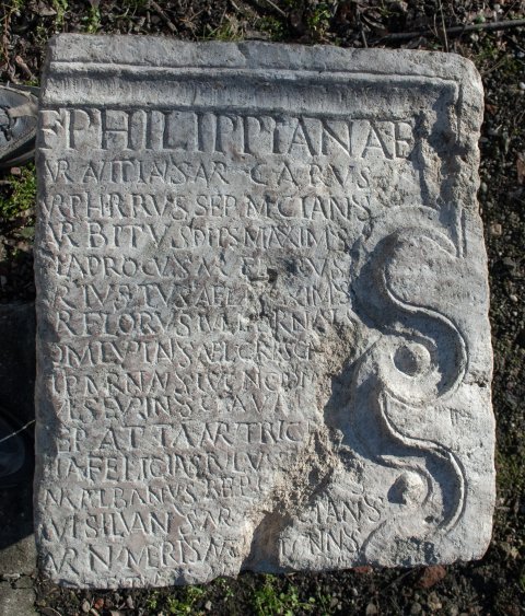 - [--- leg(ionis) p(iae)] f(idelis) Philippianae / [---] Aur(elius) Avitianus / [---] Aur(elius) Py<rrh=HRR>us / [---] Aur(elius) Bitus / [---] Cla(udius) Proculus / [---] Aur(elius) Iustus / [--- A]ur(elius) Florus / [--- D]om(itius) Lupianus / [--- V?]ip(sanius?) Mar(i)n(i)anus / [--- I]ul(ius) Sev(e)rinus / [--- S]ep(timius) Atta / [--- C]la(udius) Felicianus / [---] Aur(elius) Albanus / [---] Iul(ius) Silvanus / [---] Aur(elius) Numerius / [-----] Titian[u]s // Aur(elius) Carus / Sep(timius) M(u)cianus / Dips(---) Maximus / Aur(elius) Fl[o]rus / Ael(ius) Maximus / Iul(ius) Lernat(u)s / Ael(ius) Cresc(e)n[s] / Iul(ius) Nodia[---] / C[l]a(udius) Val[ens] / Aur(elius) Trice[---] / Iul(ius) Vit[alis] / Sep(timius) I(?)[---]us / Aur(elius) [---]lianus / Aur(elius) [An]toninus / Aur(elius) [---]ius / [