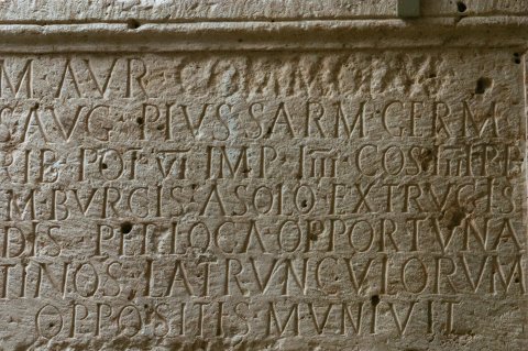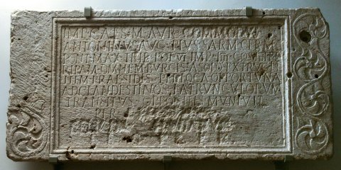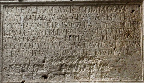 - Imp(erator) Caes(ar) M(arcus) Aur(elius) [[Commodus]] / Antoninus Aug(ustus) Pius Sarm(aticus) Germ(anicus) / pont(ifex) max(imus) trib(unicia) pot(estate) VI imp(erator) IIII co(n)s(ul) IIII p(ater) p(atriae) / ripam omnem burgis a solo extructis / item praesidis per loca opportuna / ad clandestinos latrunculorum / transitus oppositis munivit / per [[L(ucium) Cornelium / Felicem Plotianum / leg(atum) pr(o) pr(aetore)]]