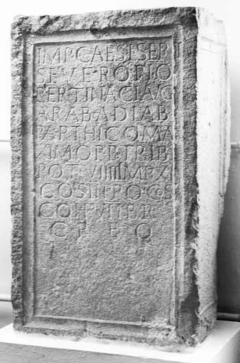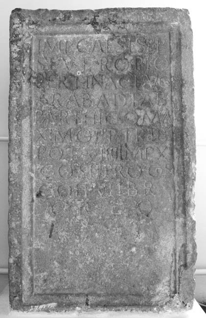 - Imp(eratori) Caes(ari) L(ucio) Sept(imio) / Severo pio / Pertinaci Aug(usto) / Arab(ico) Adiab(enico) / Parthico ma/ximo p(atri) p(atriae) trib(unicia) / pot(estate) VIIII imp(eratori) XI / co(n)s(uli) II proco(n)s(uli) / coh(ors) VII Br(eucorum) / c(ivium) R(omanorum) eq(uitata)