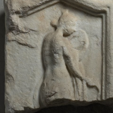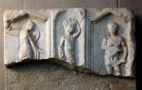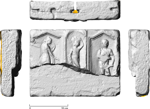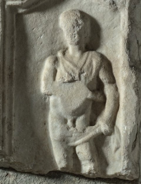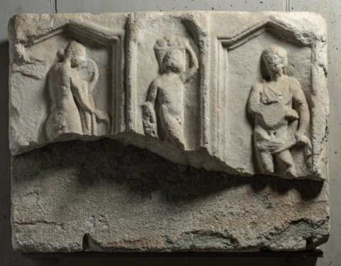 - Mythische Figur, Musikinstrument : dreiteiliges Relief, zwei Felder mit Giebel rahmen ein Feld mit Rundbogen. Links Mänade mit Tympanon im linken Arm. In der Mitte nackter Satyr, in der Rechten Winzermesser, die erhobene Linke hält einen auf der Schulter getragenen Früchtekorb. Rechts Hermaphrodit (?).