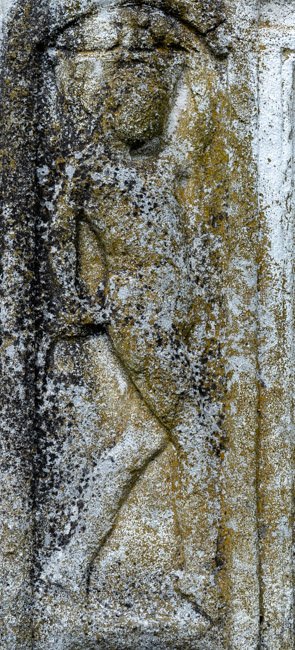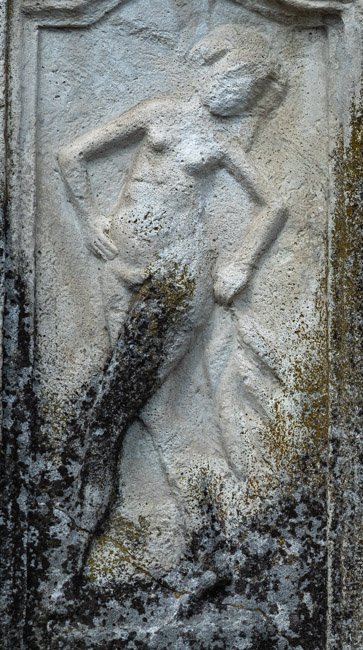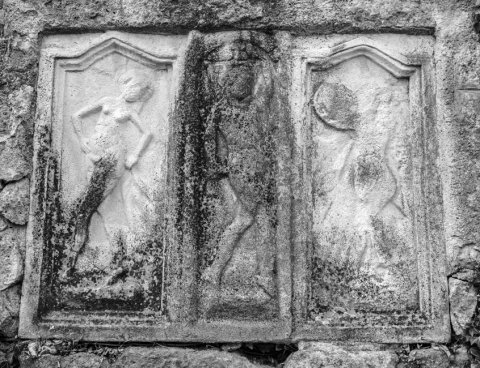 - Mythische Figur, Musikinstrument : dreiteiliges Relief, zwei Felder mit Giebel flankieren ein Feld mit Rundbogen. Links tanzende nackte Mänade, in der Mitte Satyr mit Früchtekorb auf der linken Schulter, in der Rechten Winzermesser, rechts nackte Mänade mit Tympanon.