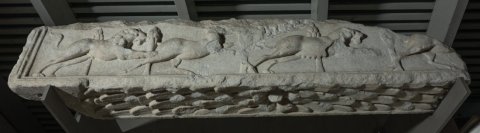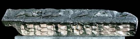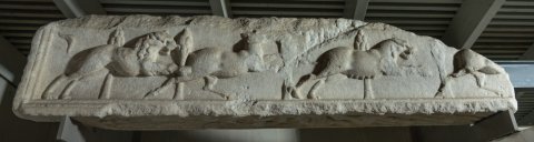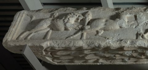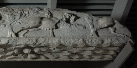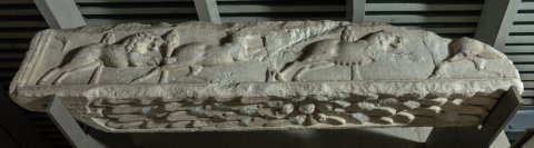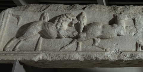 Auf der Vorderseite Fries mit Tieren: Löwen jagen Hirsche, dazwischen Bäume.