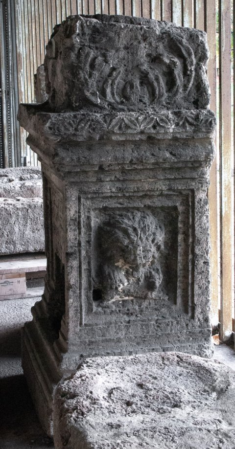 Mythische Figur : Auf dem Aufsatz auf der Vorderseite Krater mit Volutenhenkeln und hohem Fuß, flankiert von Cautes und Cautopates. Auf den Nebenseiten Zweige und Rosette. Auf dem Rand der Deckplatte Blattfries.