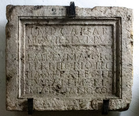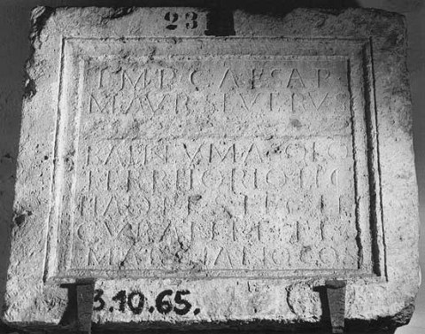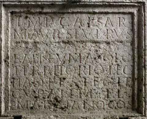 - Imp(erator) Caesar / M(arcus) Aur(elius) Severus / [[Alexander pius felix Aug(ustus)]] / balneum a solo / territorio leg(ionis) / II ad(iutricis) p(iae) f(idelis) S(everianae) fecit / curante Fl(avio) / Marciano co(n)s(ulari)