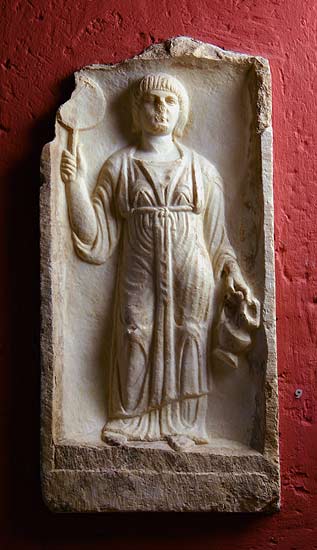 - Dienerin: einheimisches Mädchen mit kurzem Haar, Unter- und Obergewand, Gürtel, in der Rechten Spiegel, in der Linken Kanne.