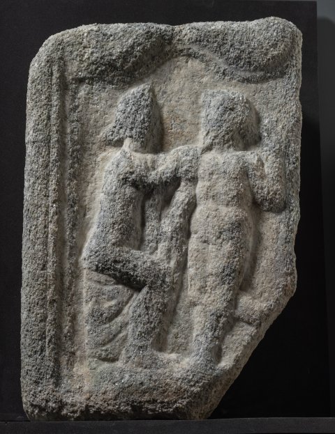 - Mythische Figuren : Rechteckfeld mit oben geschwungenem, profiliertem Rahmen. Links sitzende unbekleidete Frau mit Haarknoten und Diadem, legt ihre Rechte auf die Schulter eines vor ihr stehenden kleineren nackten Mannes mit erhobenem linken Arm. Venus und Mars oder Adonis ? Mänade und Satyr ?