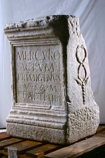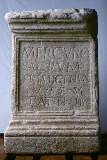 - Mercurio / sacrum / Primigenius / v(otum) s(olvit) l(ibens) m(erito) / T(iti) Atti lib(ertus)