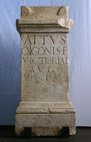 - Attus / Oiconis f(ilius) / Victoriae / Aug(ustae) / v(otum) s(olvit) l(ibens) m(erito)
