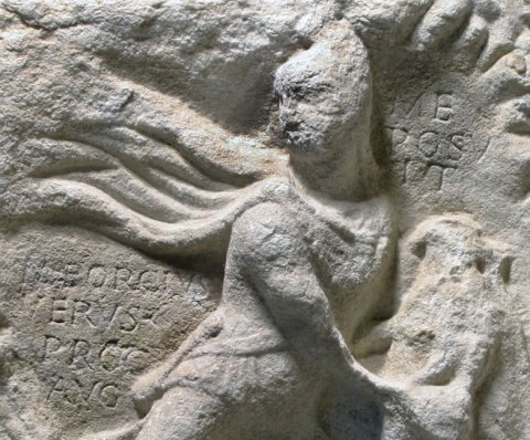 - Mythos (Mithras) : Stiertötung (Tauroktonie) zwischen Cautes und Cautopates in eigenen Nischen mit Giebel. Inschrift rechts und links der Mithrasfigur.