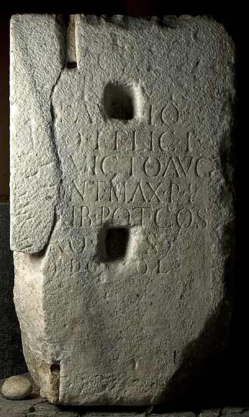 - I[mp(eratori)] Cae[s]/ar(i) [M(arco) A]ur(elio) / [C]laudio / [Pi]o Felici / [In]victo Aug(usto) / [po]nt(ifici) max(imo) p(atri) p(atriae) / [t]rib(unicia) pot(estate) co(n)s(uli) / [p]ro[co(n)]s(uli) / ordo Sol(vensium)