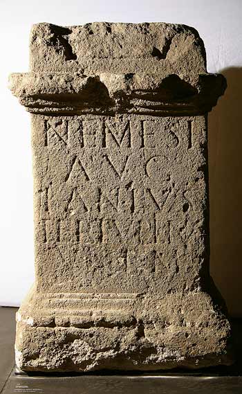 - Nemesi / Aug(ustae) / Kanius / Tertullinus / v(otum) s(olvit) l(ibens) m(erito)