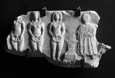 - Mythische Figuren: drei frontal stehende nackte Quellnymphen mit offenem Haar, jede hält mit beiden Händen eine Muschelschale. Rechts Altar, dem sich von rechts zwei Opfernde nähern (Mann in halblangem Ärmelgewand, in der Linken Schale, von der zweiten Figur nur Hand auf der Schulter der vorderen und Rest des Kleides sichtbar).