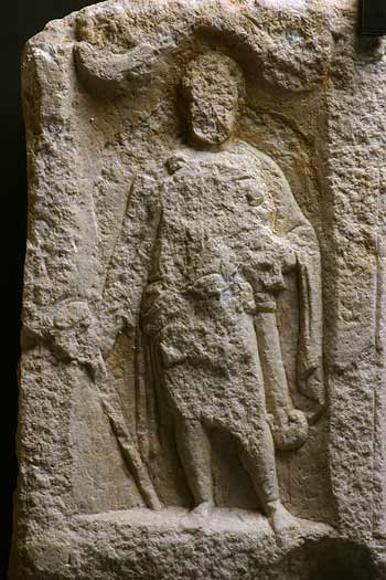 - Im linken Bildfeld unter Bogen mit geschwungenen Enden stehende Ganzfigur eines Mannes in kurzer Tunica und Sagum mit Fibel, in der Rechten Stock. Im rechten Feld zwei stehende Männer in kurzer Ärmeltunica, Gürtel mit Ringschnalle, Sagum mit Armbrust(?)fibel, in der Rechten Stock (vitis).