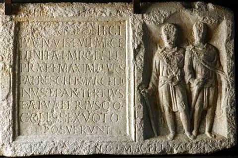 - P[ro s]alute collegi(i) / iuventutis et Ulp(i) Marce/llini et Ael(i) Marcelli / praef(ectorum) et Maximi et Ursi / patres(!) Gell(ius) Marcelli/nus et Pant() Tertius / et Ael(ius) Valerius qq(uaestores) / coll(egii) s(upra) s(cripti) ex voto / posuerunt / I[-----]I[-----]ino Marcell(inus) Valeriu[s ---]