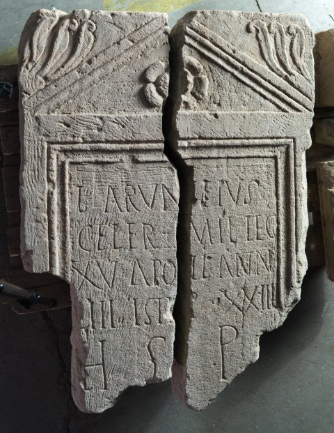 - L(ucius) Arunteius / Celer mil(es) leg(ionis) / XV Apoll(inaris) ann(orum) / LIIII stip(endiorum) XXIIII / h(ic) s(itus) p(?)