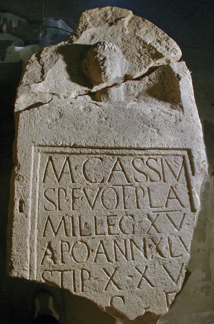 - M(arcus) Cassius / Sp(urii) f(ilius) Vot(uria) Pla(centia) / mil(es) leg(ionis) XV Apo(llinaris) ann(orum) XLV / stip(endiorum) XXV / [h(ic)] s(itus) e(st)