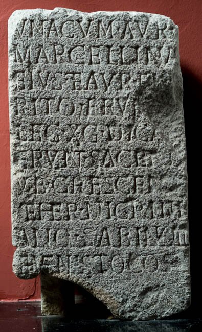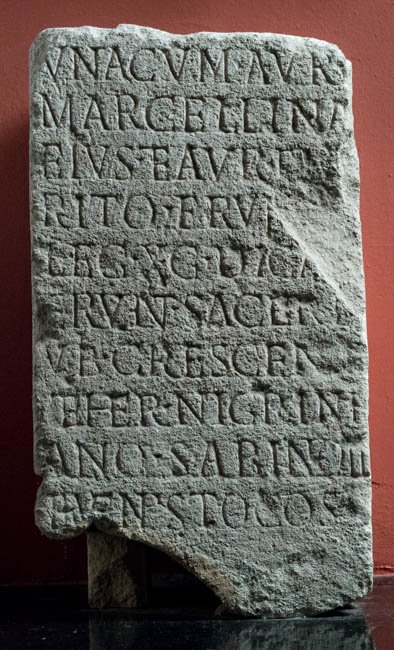 - ---] / una cum Aur(elia) / Marcellina / eius et Aur(elio) Em[e]/rito frum[ent(ario)] / leg(ionis) X g(eminae) dica[v]/erunt sacerd(otibus) / Vib(io) Crescen[te] / et Her(ennio) Nigrini/ano Sabino II / et Venusto co(n)s(ulibus)