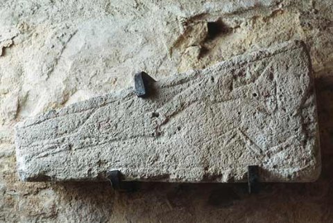 - Linke Giebelecke mit Ritzzeichnung eines Delphins, rechts Rest eines Kranzes ?