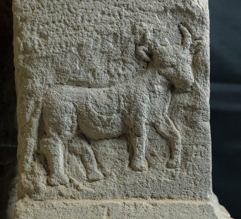 - Auf der linken Nebenseite nach rechts gehendes Rind, auf der Flanke Mondsichel.