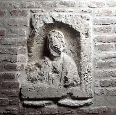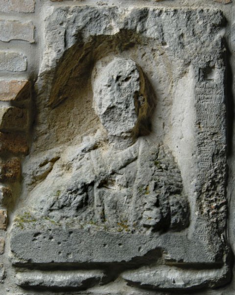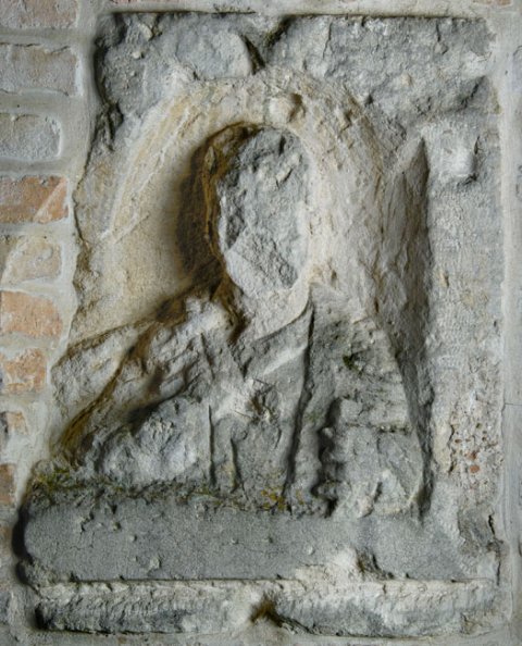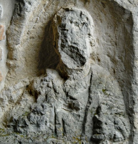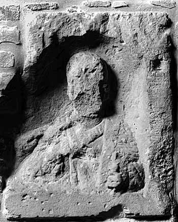 - In Bogennische Brustbild eines Mannes in Ärmeltunica, Sagum mit Fransen und Fibel, in der linken Hand Rolle (volumen). Links vermutlich weiterer Bogen und Brustbild.