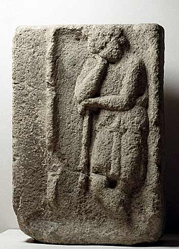 - Mythische Figur: Attis mit phrygischer Mütze, Hirtentasche und -stab, überkreuzte Beine, Kopf in die rechte Hand gelegt.