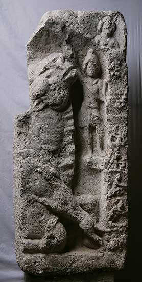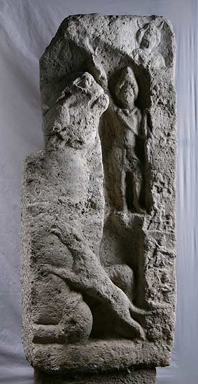 - Mythos (Mithras): Stiertötung (Tauroktonie) mit Hund und Cautes mit erhobener Fackel, rechts oben Büste der Luna mit Mondsichel hinter dem Kopf. Auf der rechten Rahmenleiste sieben kleine Felder mit Mithras-Szenen.