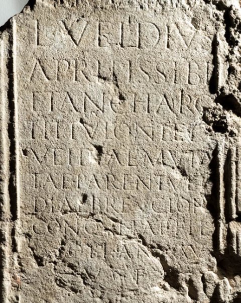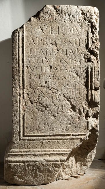- L(ucius) Veidius / Aprilis sibi / et Anchario / Tittuloni et / Veid[i]ae Muta/tae parent(ibus) Vei/diae Breucion[i] / con(iugi) Quietae fil(iae) / obi(tae) an(norum) XXV / v(ivus) f(ecit)