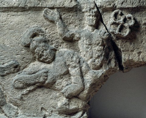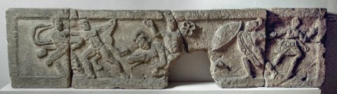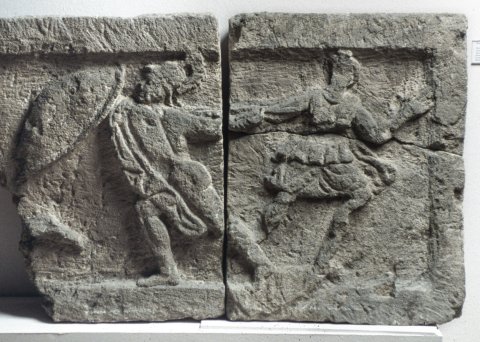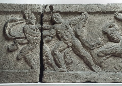 - Mythos: Kampf zwischen Herakles (Hercules) und Ares (Mars) über der Leiche des Kyknos. In der Mitte liegt der Riese Kyknos mit Helm auf einem Felsen, hinter ihm steht Hermes (Mercur) mit großem Heroldsstab. Links reißt Athena (Minerva) in Helm, Chiton und Mantel mit beiden Händen Herakles zurück. Er schwingt mit der Rechten die Keule, vom linken Arm flattert das Löwenfell. Rechts stürmt Ares mit Helm, Mantel, Schild heran, seinen rechten Arm mit der Lanze hält Artemis (Diana) zurück.