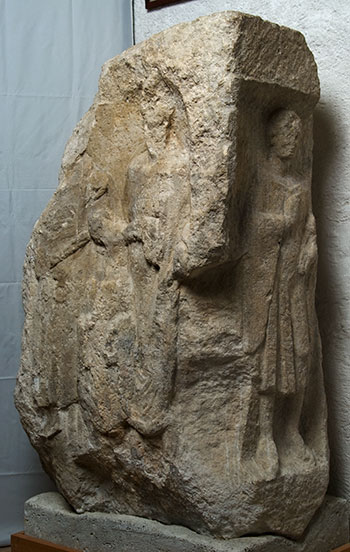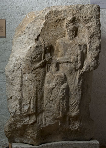 Eckblock: auf der Vorderseite Familie: Ganzfiguren eines Ehepaares mit Kind. Links Frau, rechts Mann in Toga, in der Linken Rolle (volumen) (?). Vor ihm Kind mit Umhang.