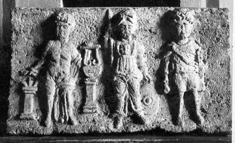 - Mythische Figur, Musikinstrument : drei frontal stehende Götter. Links zwischen zwei Altären Apollo, Mantel um linken Arm und linkes Bein, in der Rechten Opfergabe (?), in der Linken Kithara. In der Mitte Minerva mit Helm, Peplos und Ägis, in der Rechten Lanze, die Linke auf kleinem Rundschild. Rechts Mercur in kurzem Chiton und Mantel, im Haar kleine Flügel, in der Rechten Geldbeutel, in der Linken Heroldsstab (caduceus).