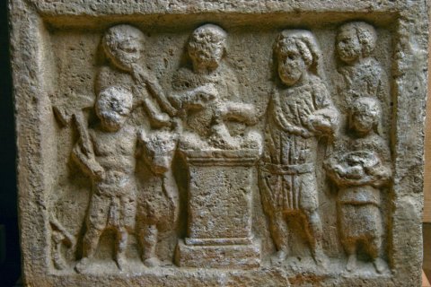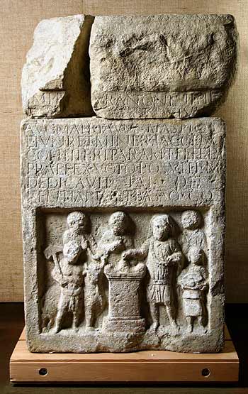 Auf der Vorderseite, unterhalb der Inschrift Opferszene, Musikinstrument : In der Mitte Altar, rechts davon opfernder Mann (Offizier) in kurzer Tunica mit Gürtel und Sagum. Rechts von ihm Knabe, der große Schale mit Früchten hält. Hinter ihm Mann. Links des Altars Opferdiener mit Stier und Beil in der Rechten. Hinter ihm Musikant mit Doppelflöte. Hinter dem Altar weibliche Figur.