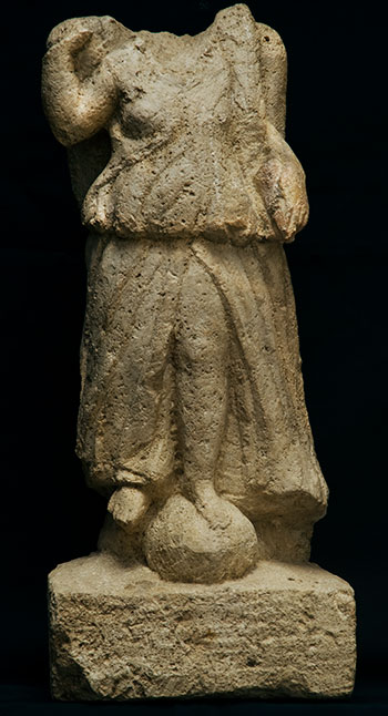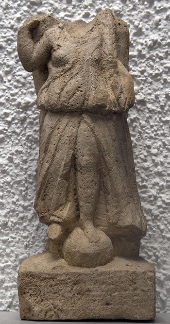 - Mythische Figur: schwebende Victoria in Chiton mit langem Überschlag, linker Fuß auf einer Kugel (Globus), im linken Arm Palmzweig, rechter Arm angewinkelt erhoben, in der Hand vermutlich ein Kranz. Eckige massive Plinthe.