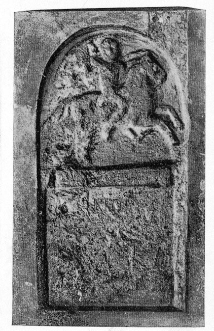 - In eingetieftem Bildfeld mit halbrundem Abschluss nach rechts galoppierender Reiter (Soldat), in der erhobenen Rechten Lanze. Breite Standleiste, darunter leeres Feld (Inschrift ?).