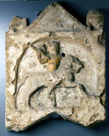 Im Hauptbild in bogenförmig gerahmter Nische nach rechts galoppierender Reiter (Soldat), in der erhobenen Rechten Lanze. Unter dem Bauch des Pferdes Stütze oder Baumstamm. In den Rahmenleibungen gemaltes Palmzweigmuster, Bildhintergrund getupft.