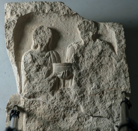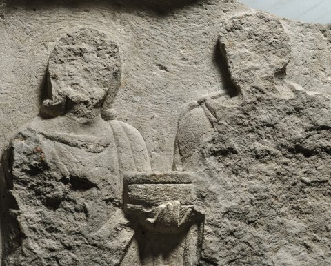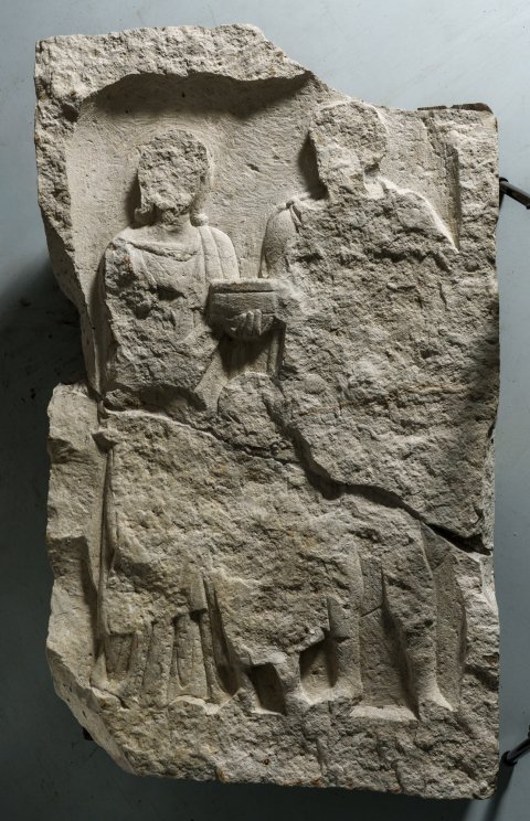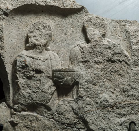 - Familie : stehende Ganzfiguren eines Ehepaares mit Kind. Links Frau in langem Gewand und Mantel, in der Linken runder Behälter. Rechts Mann mit kurzer Tunica und Sagum mit Scheibenfibel. Zwischen den Eltern Knabe in halblangem Gewand.
