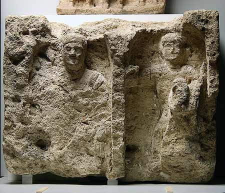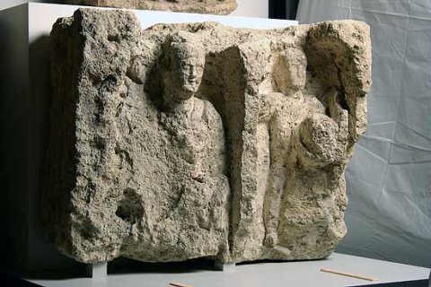 - Zwei oben halbrund gerahmte Nischen, getrennt durch Pilaster. In der linken Nische stehender bartloser Mann, in der Rechten Lanze (heute nicht mehr sichtbar), In der rechten NIsche frontal dargestellter Reiter (Soldat) mit Schild an seiner linken Seite.