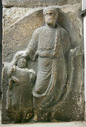 Eckblock: auf der Vorderseite Familie : in bogenförmig abgeschlossener Nische stehende Ganzfiguren eines Mannes in Stiefeln, Tunica und Toga und eines Kindes (Knabe) in kurzem Gewand, Gegenstand in der Linken.