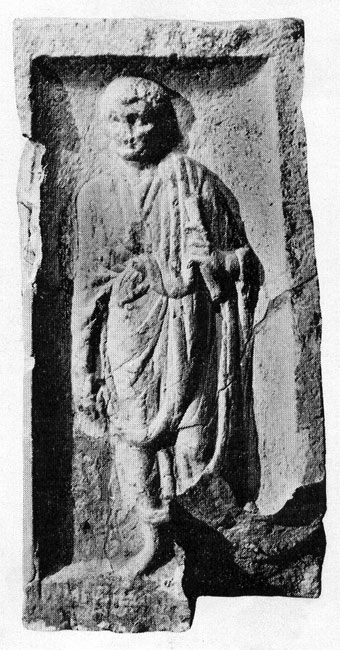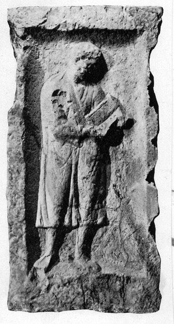 Auf der rechten Nebenseite in Rechtecknische stehender Mann in Tunica und Toga, in der Linken Rolle (volumen). - Kommentar