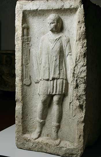 Auf der rechten Nebenseite in Rechteckfeld stehender Mann (Soldat) in kurzer Tunica, Paenula und Stiefeln. Waffen: in der Rechten Gürtel (Balteus) mit daran befestigter Schwertscheide mit Dosenortband.