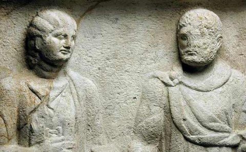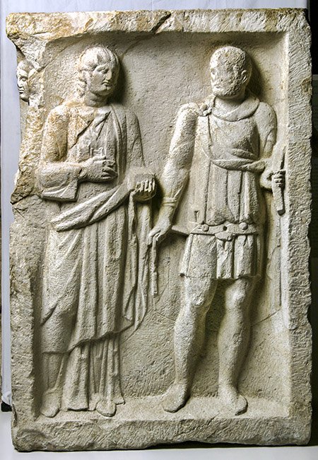 Auf der Vorderseite in Rechtecknische zwei stehende Ganzfiguren (Ehepaar). Links Frau in Schuhen, Ärmeltunica und Mantel, in der Linken Kästchen. Mittelscheitel, gewelltes Haar. Rechts bärtiger Mann (Soldat) in kurzer Tunica mit breitem Gürtel mit Beschlägen und Ringschnalle, Sagum mit Scheibenfibel, Schuhen, in der Linken Rolle (volumen oder Tuch ?), um den rechten Unterarm Armreif (armilla), in der Rechten Gürtelende.