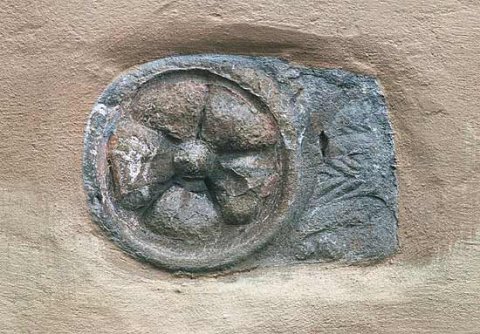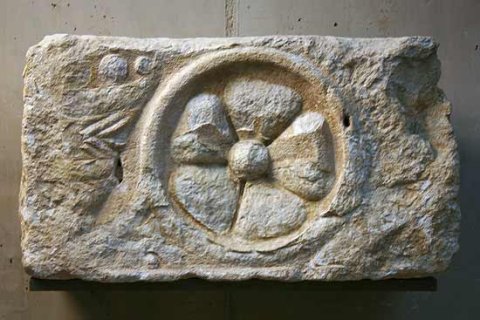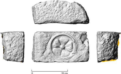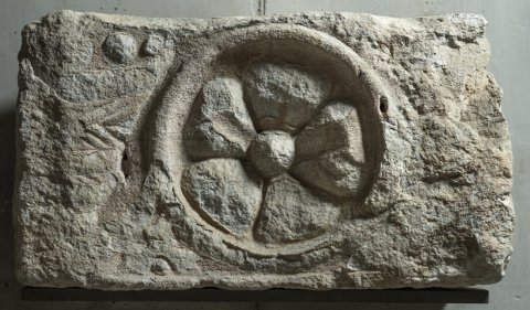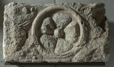 - Teil der Gebälkzone einer Aedicula (?), leicht konkav gewölbt. Medaillon mit Rosette, seitlich Früchtekorb.