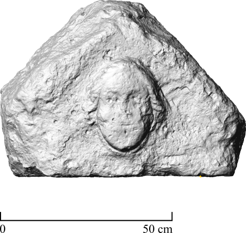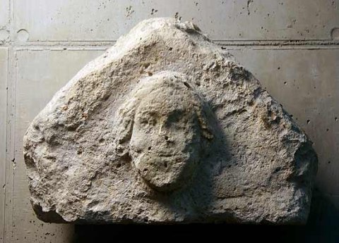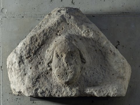 - Block vom oberen Abschluss einer Umfassungsmauer (oder Teil einer Firstkappe ?), auf der Stirnseite weibliches Gesicht.