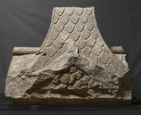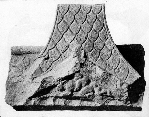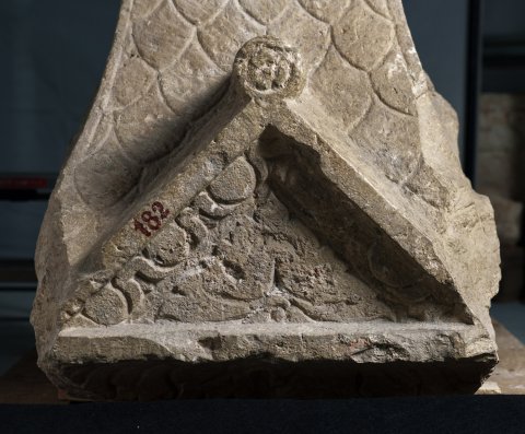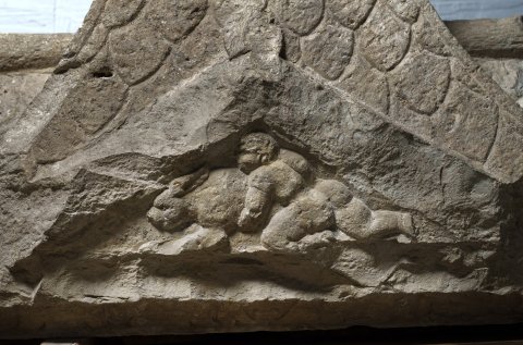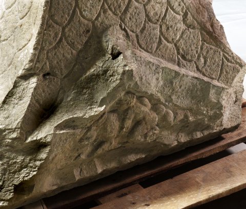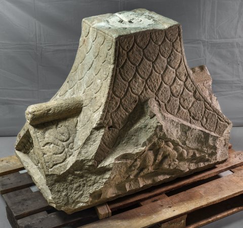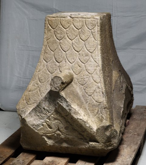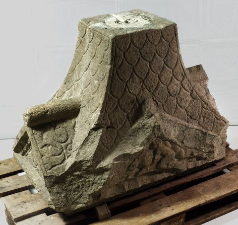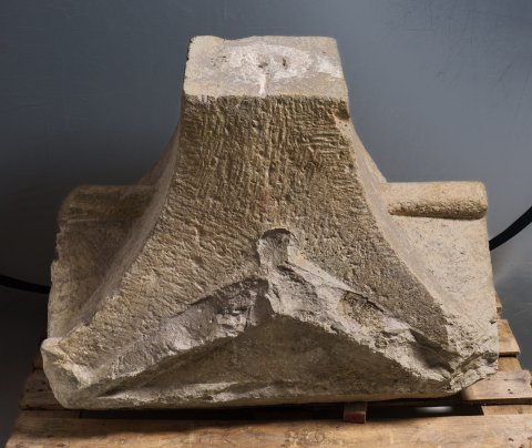 - Giebel tlw. abgeschlagen, in der Oberseite Dübelloch mit Gusskanal