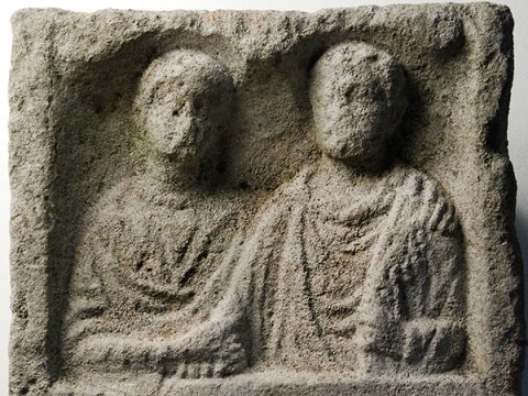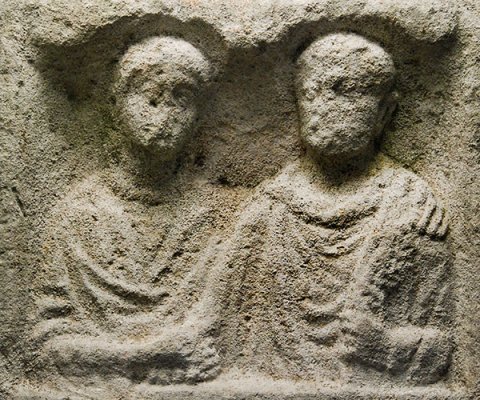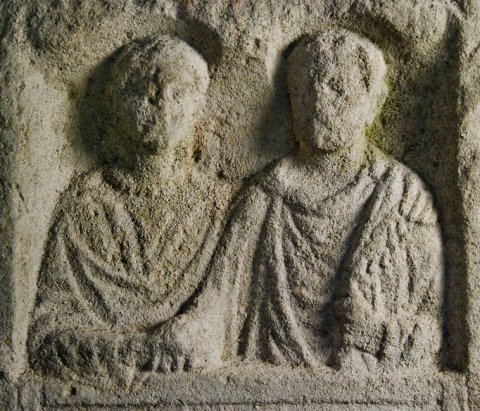 Im Hauptbild unter Doppelbogen zwei Halbfiguren (Ehepaar). Links Frau: Halskette, Tunica, Mantel. Rechts Mann: bärtig, Ärmeltunica, Sagum mit Fransen, in der Linken Rolle (volumen).