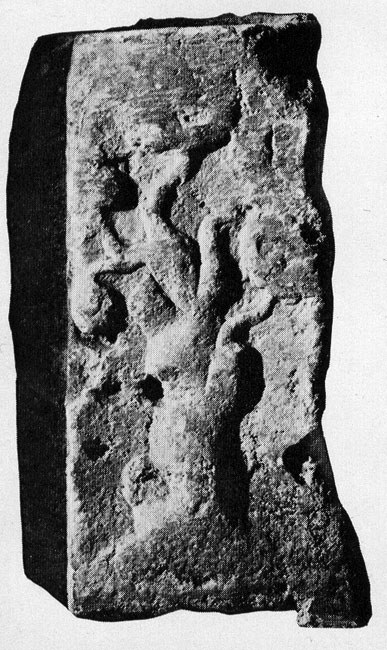 Auf der Vorderseite rechteckige Nische, darin vor Muschelhintergrund frontal sitzender (?) Mann (oder Dreiviertelfigur ?), Mantel über den Schultern, linker Arm nach außen abgewinkelt. In der Hand Gefäß oder Rolle (volumen) (?).
