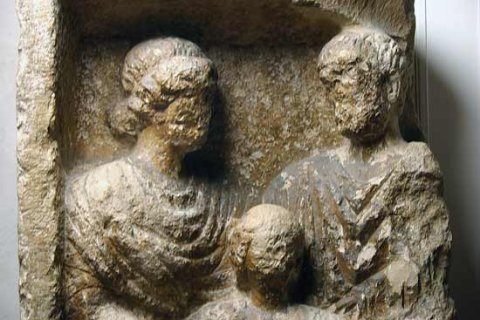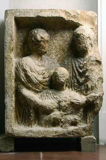 Auf der Vorderseite in Rechtecknische Halbfiguren einer Familie (Ehepaar mit Kind). Links Frau mit Nackenknoten, Mantel um beide Schultern geschlungen. Rechts bärtiger Mann im Mantel. Vorn Mädchen in Ärmeltunica, in der Rechten Blüte (?).