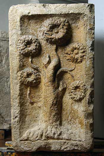 - rechts abgebr., verwittert, in der Oberseite Dübelloch