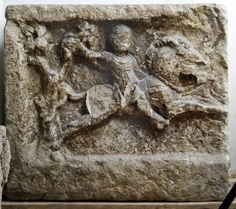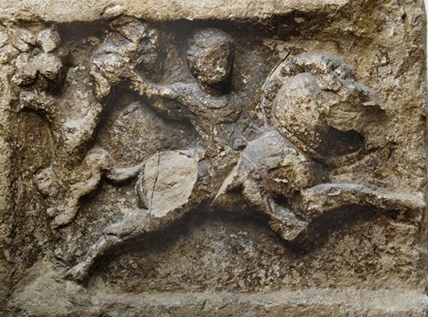 Eckblock: auf der Vorderseite Jagdszene: nach rechts galoppiernder Reiter mit nachwehendem Mantel, rechter Arm (mit Speer ?) erhoben. Am linken Bildrand Baum.
